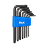 CONJUNTO COM 7 CHAVES ALLEN TORX DE TAMANHO CURTO, FABRICADAS EM AÇO RESISTENTE, INDICADAS PARA APERTO E DESMONTAGEM DE PARAFUSOS COM PERFIL TORX EM EQUIPAMENTOS MECÂNICOS, ELETRÔNICOS E AUTOMOTIVOS.