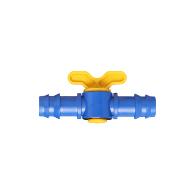 CONECTOR (REGISTRO DE UNIÃO) DE ½ POLEGADA DA MARCA AGROJET, COM CORPO NA COR AZUL E MANOPLA AMARELA, UTILIZADO PARA UNIÃO DE LINHAS DE ½” E CONTROLE DE FLUXO EM SISTEMAS HIDRÁULICOS.